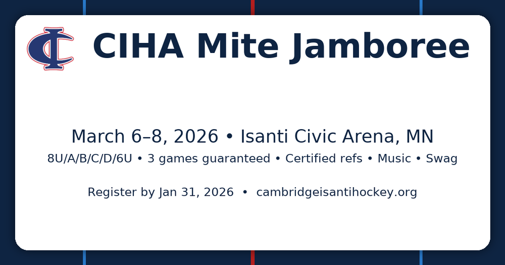 Cambridge-Isanti Hockey Association (CIHA) is a 501(c)(3) nonprofit organization focused on developing youth hockey players and supporting a strong feeder system for our local high school programs. Operated by dedicated volunteers, CIHA promotes skill development, sportsmanship, and a lifelong love for the game.